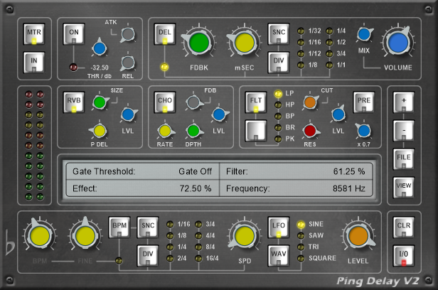 Ping Pong Delay mit Gate, LFO modulierbarem Filter, Chorus und Reverb.